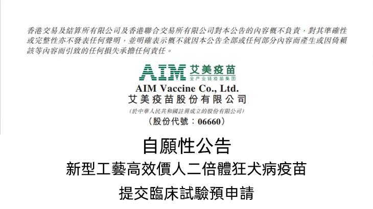 公告 | 新型工艺高效价人二倍体狂犬病疫苗提交临床试验预申请