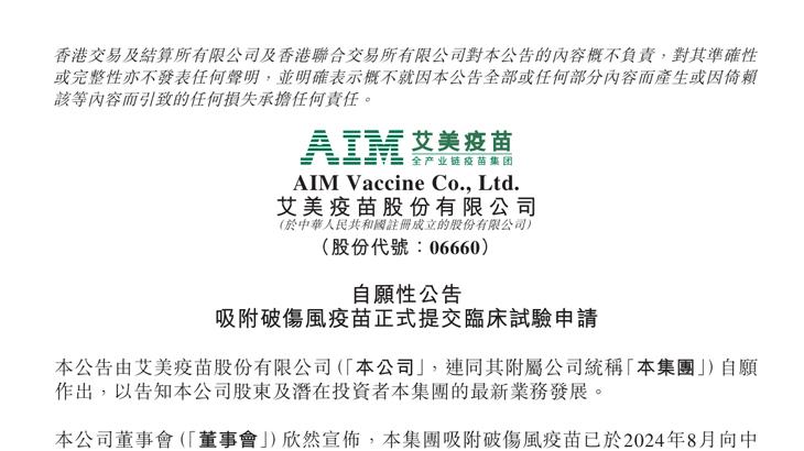 本公司董事会欣然宣布,,,,本集团已于2024年3月27日提交b型流感嗜 血杆菌(Hib)结合疫苗的临床试验预申请,,,且已于2024年2月9日提交吸附破伤风 疫苗的临床试验预申请。。