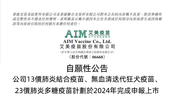 公告 | 公司13价肺炎结合疫苗、、无血清迭代狂犬疫苗、、 23价肺炎多糖疫苗计划于2024年完成申报上市