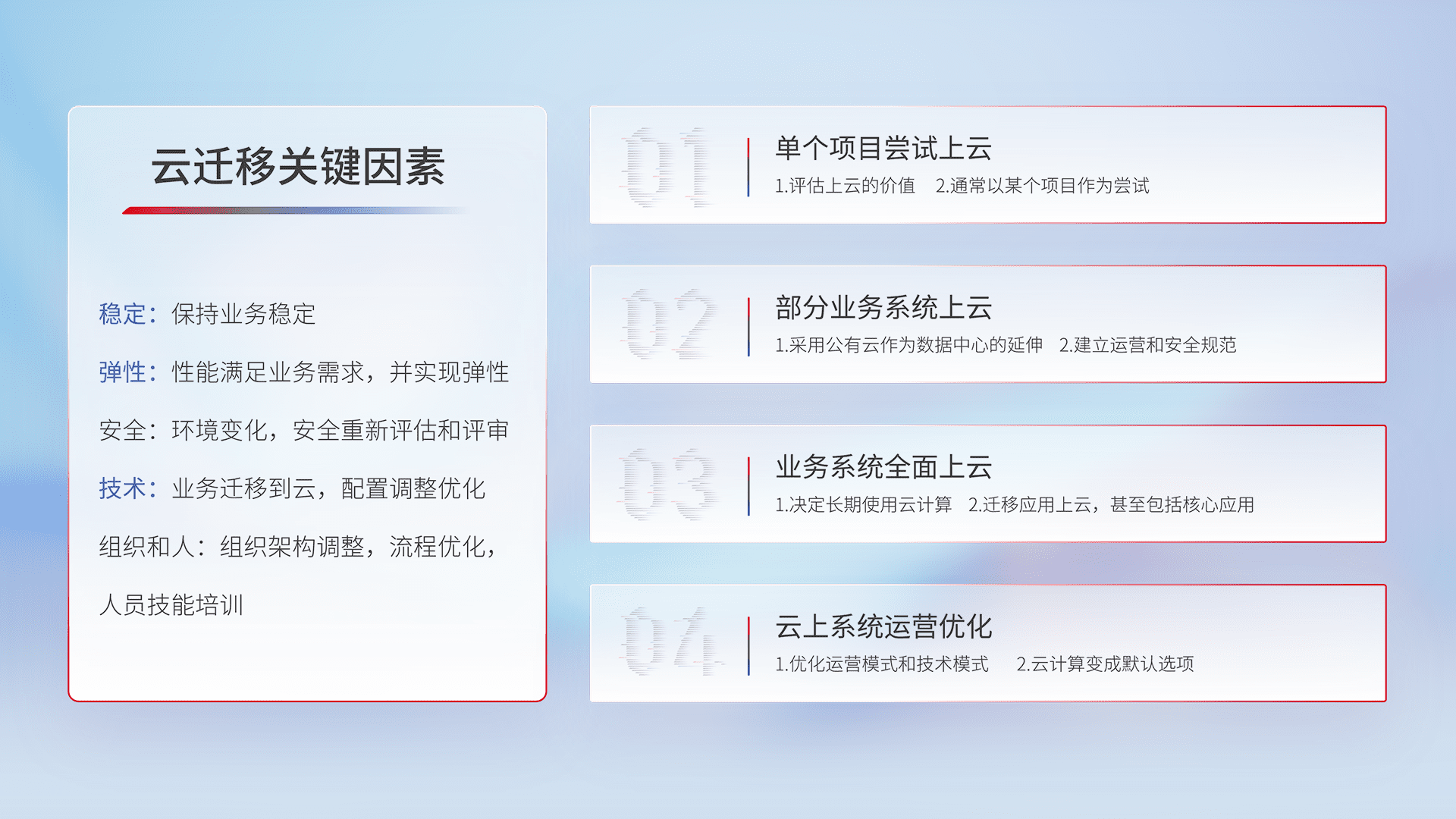 结合实际业务,,,从规划设计、、云平台选型、、、、云原生改造、、、、数据迁移、、、、集成交付,,迁移全过程为客户识别最佳上云路径,,,,做好风险识别管理,,,设计网络架构、、、、身份权限、、、安全审计合规、、、操作审计、、、日志审计、、、监控告警策略、、多站点容灾设计等,,,对云上基础设施进行整体规划,,,提升IT治理水平,,,以满足弹性、、高可用、、高性能的需求。。。