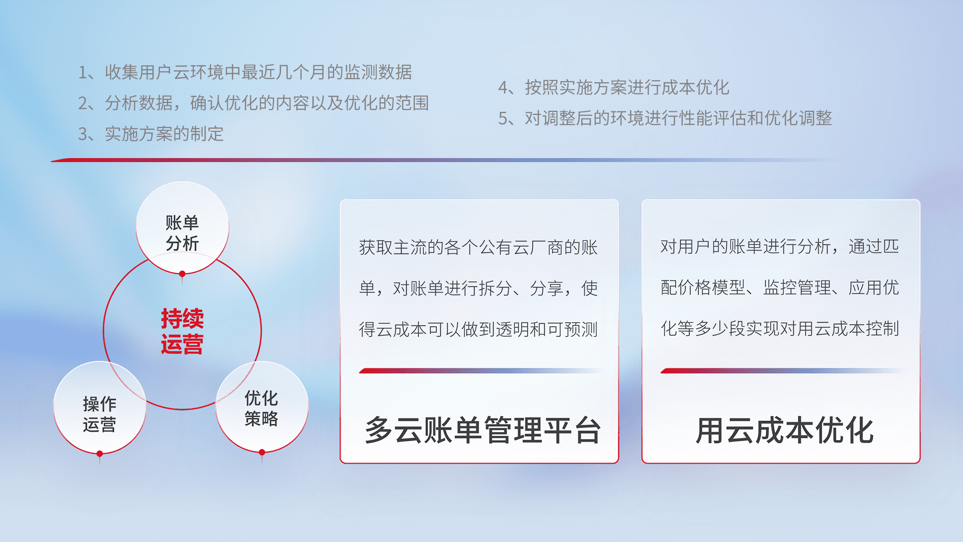 通过多云纳管,,,,以统一的资源数据模型把客户的云资源进行抽象和封装,,,进而实现对多云资源的统一操作,,保障云资源管理的可靠性、、、、稳定性与可用性。。。。量身定制化运维内容,,配置、、开发运维、、、、补丁管理、、、备份、、、、监控、、认证和访问管理、、、、审计和日常巡检等,,保障在用云过程中的可靠度,,,稳定度以及高可用率。。。。