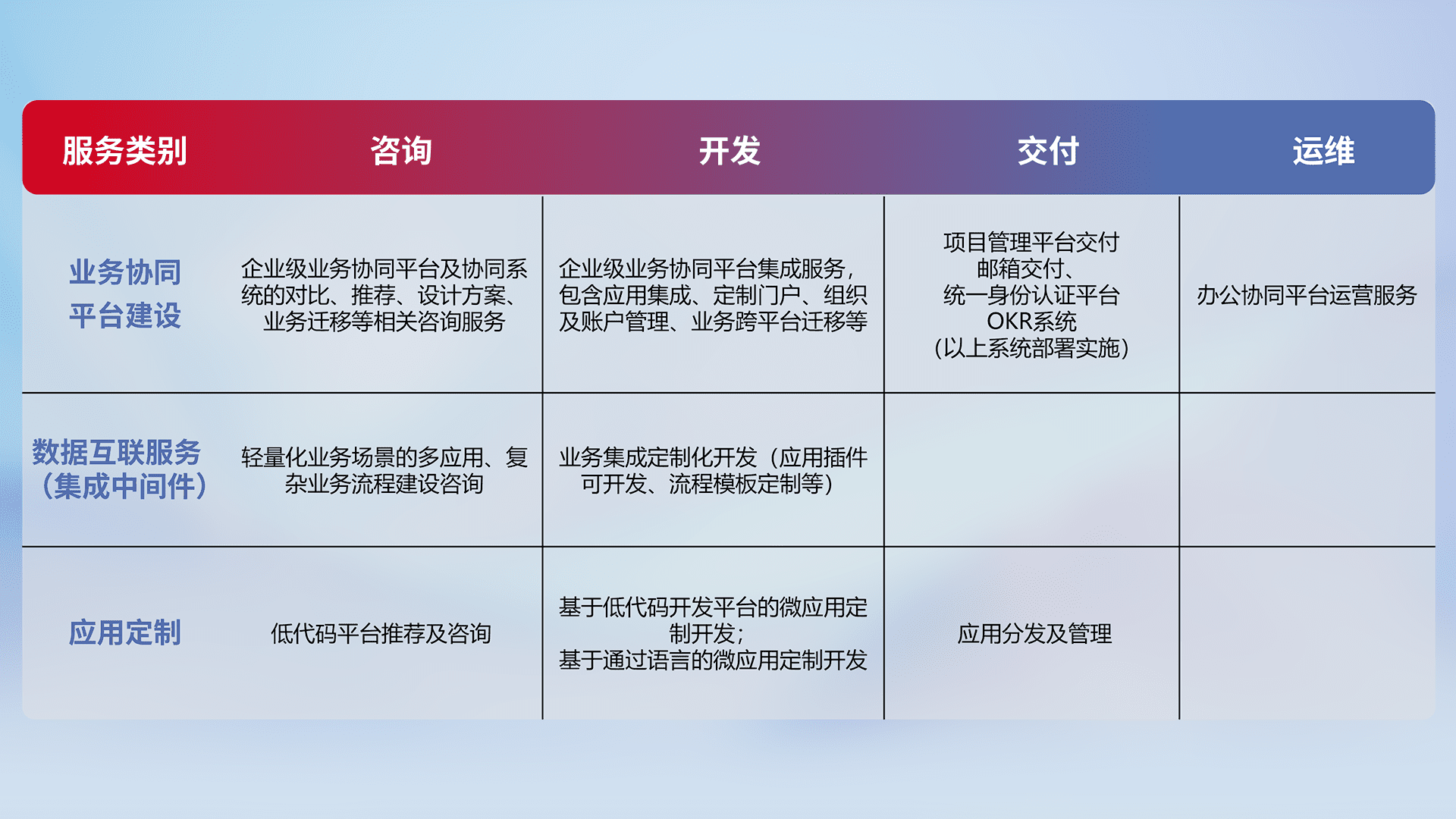 针对钉钉、、企微、、、、IDaas等平台级产品提供产品的规划、、、、方案、、、、交付、、、定制化开发等服务,,,实现如统一协同办公、、智能客户服务、、、混合会议管理、、、智能数据查询、、等业务场景,,,实现数字化转型。。